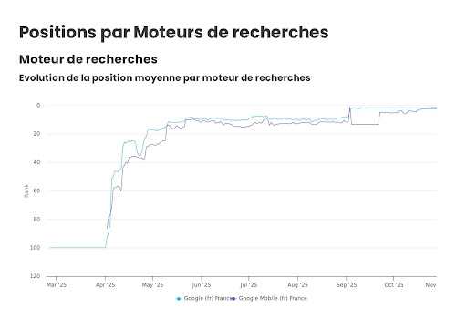 À partir du mois d’avril 2025, la progression s’est nettement accélérée. Google a commencé à valoriser les nouvelles optimisations et le contenu récent. Les courbes parlent d’elles-mêmes : une montée rapide, puis une stabilisation durable dans le haut du classement.